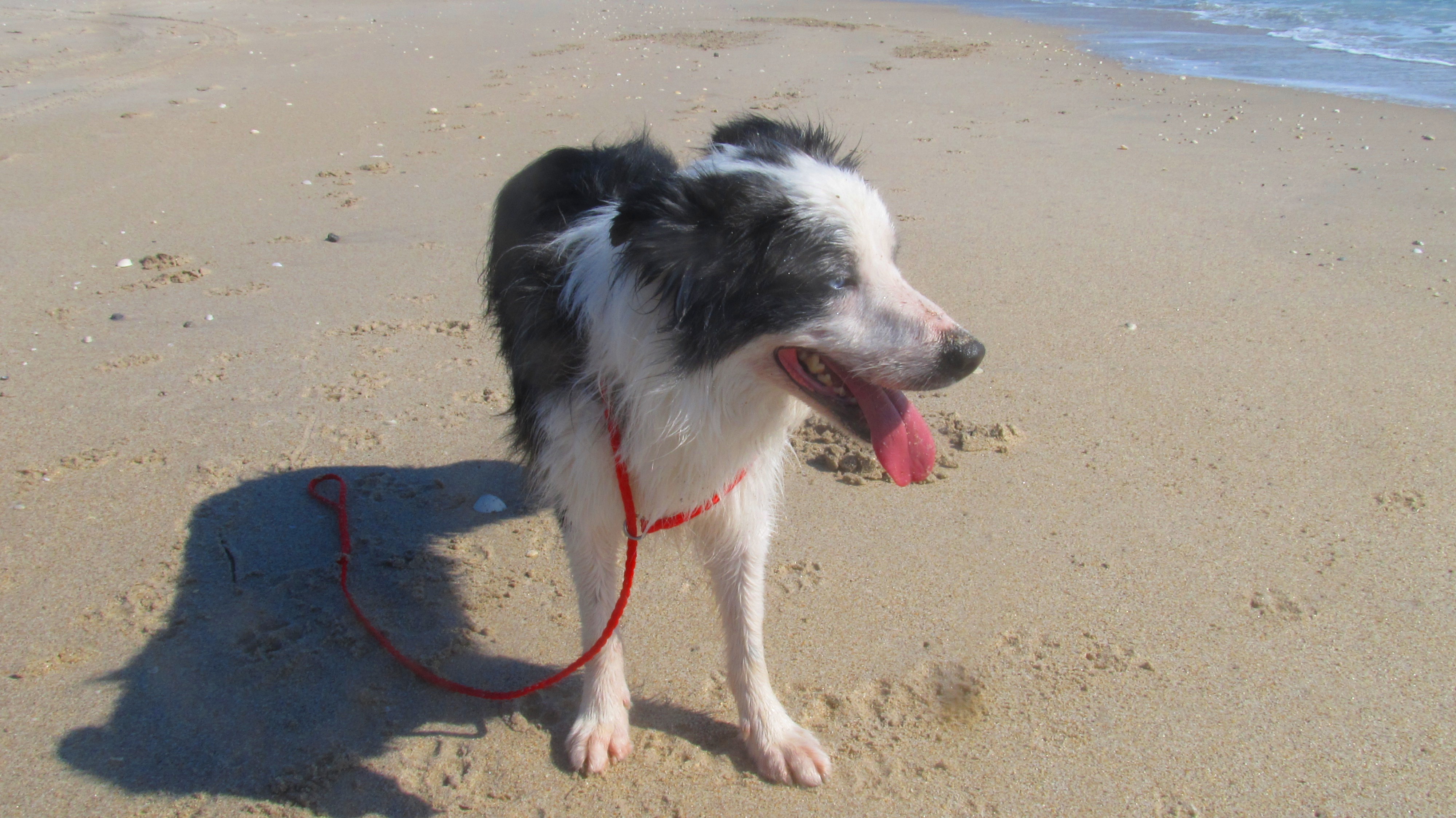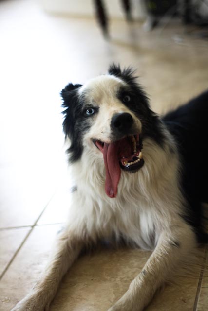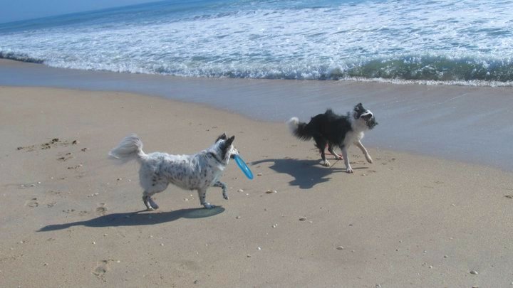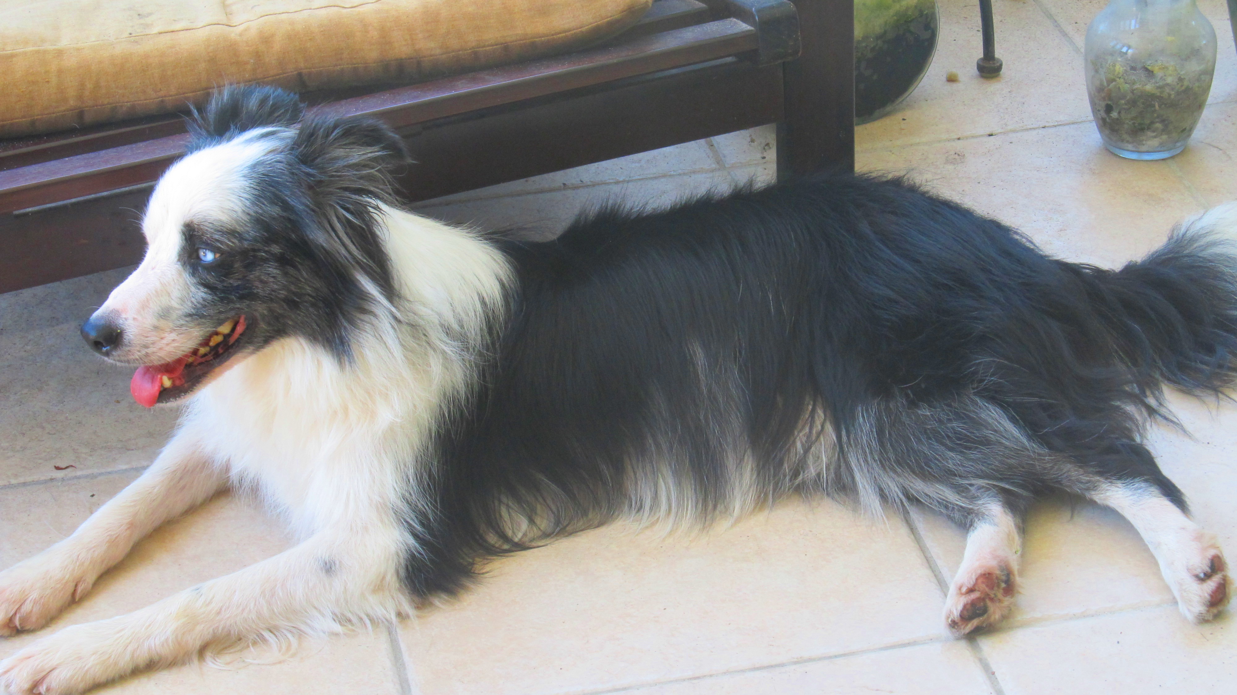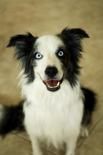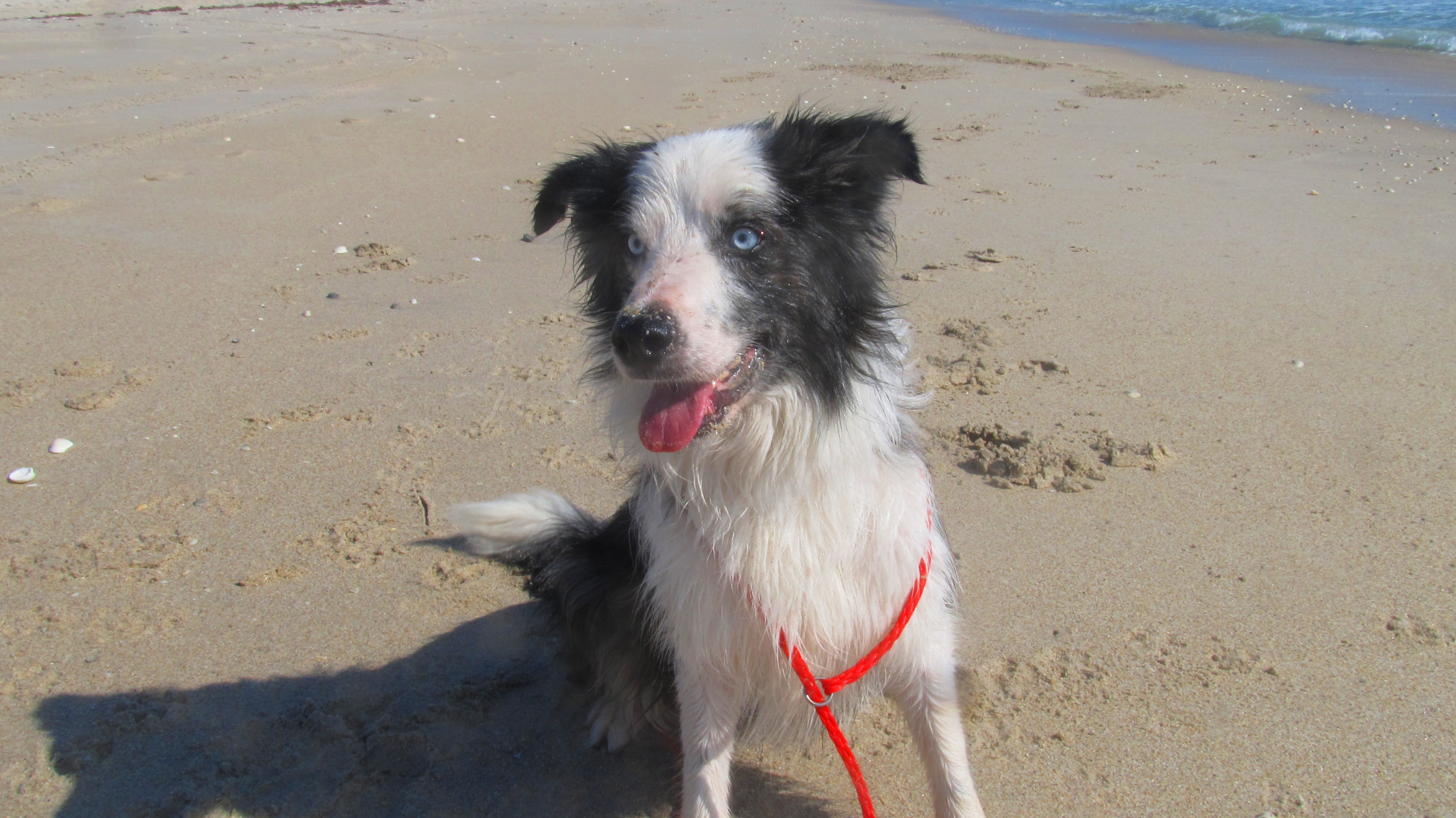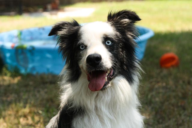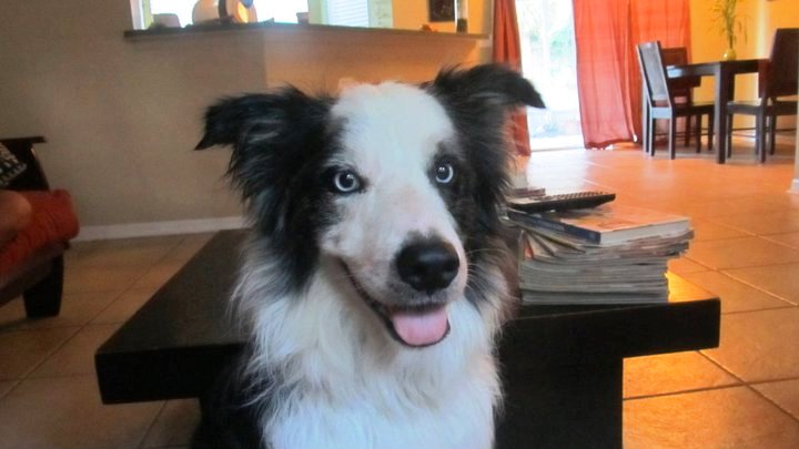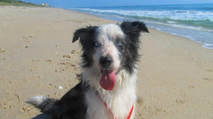 He’s very intelligent, thus the Title of his name!  Although he’s playful with the ball and Frisbee, he’s not an in your face Border Collie, he’s quite calm.  He’s doing well with Adriana’s dog Gidget (Magpie) and he’s really enjoying the pool!When he went to the beach, everyone just fell in love with him. I mean, gosh, who wouldn’t? With those beautiful blue eyes, perfect border collie markings and joyful spirit, he just makes you want to smile!