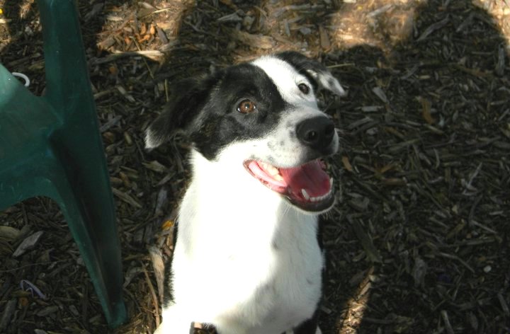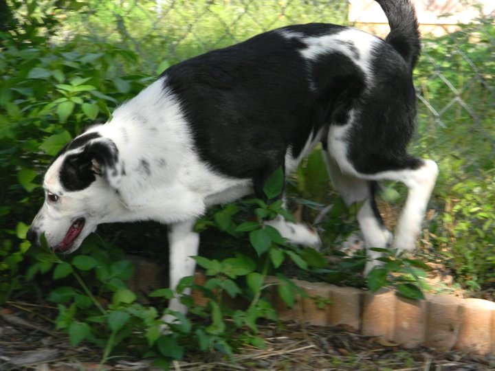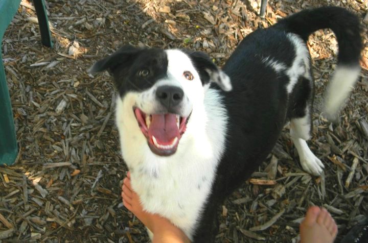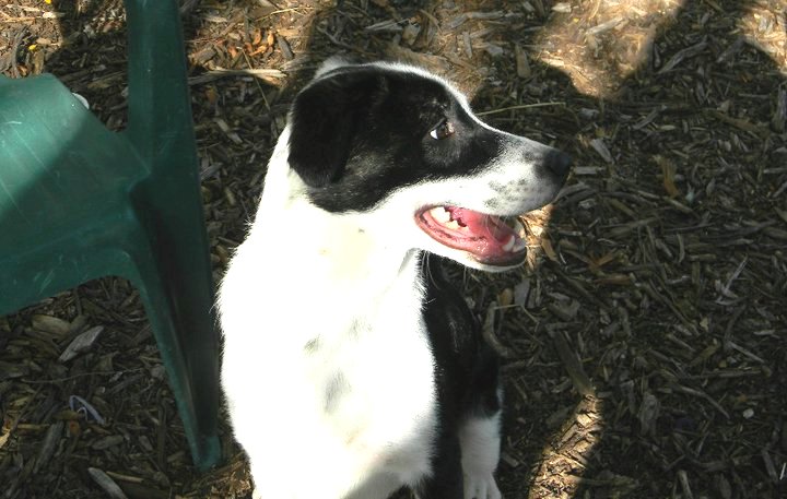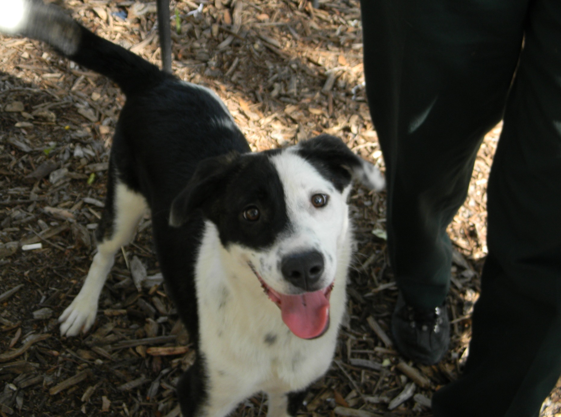 history:  Jelly Bean is a young Border Collie boy, with the coveted split face. There may be a touch of another breed in him, but he presents predominately Border Collie in both appearance and temperament. I wonder if it is Beagle, since he is rather small at 35 pounds or so. Jelly Bean is a product of Aloma Jancy Animal Hospital, a place where countless dogs are dropped off, only to have their owners never show up to reclaim their dogs.  It’s pathetic.  Still day after day, Aloma Jancy saves lives, and rehomes the dogs that they can… they really work hard.