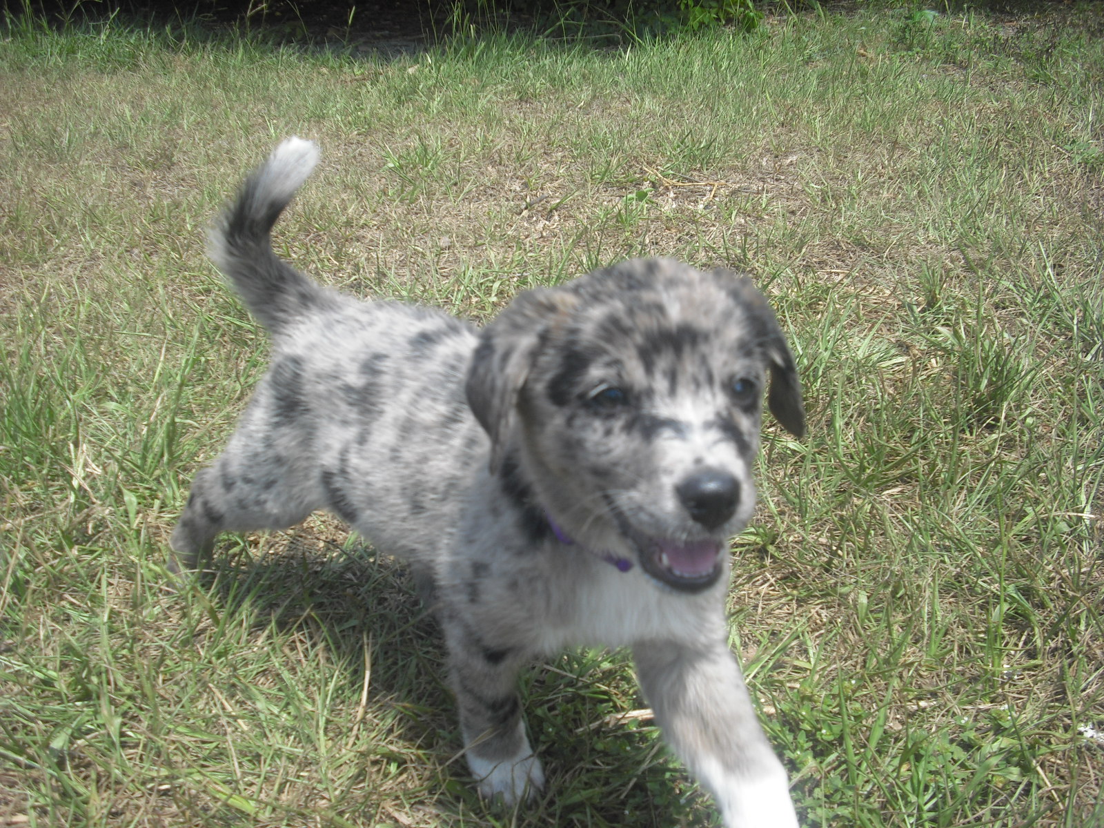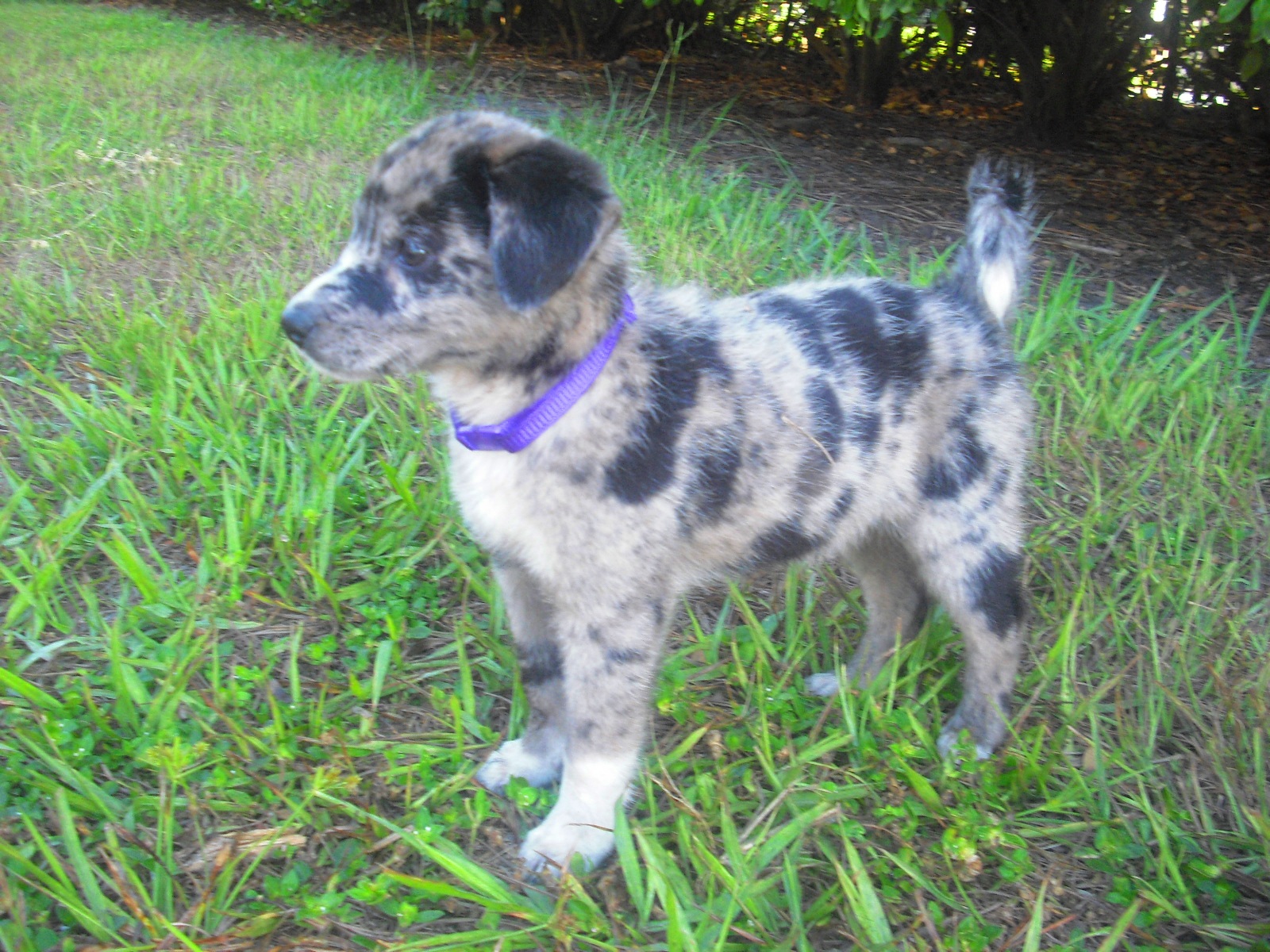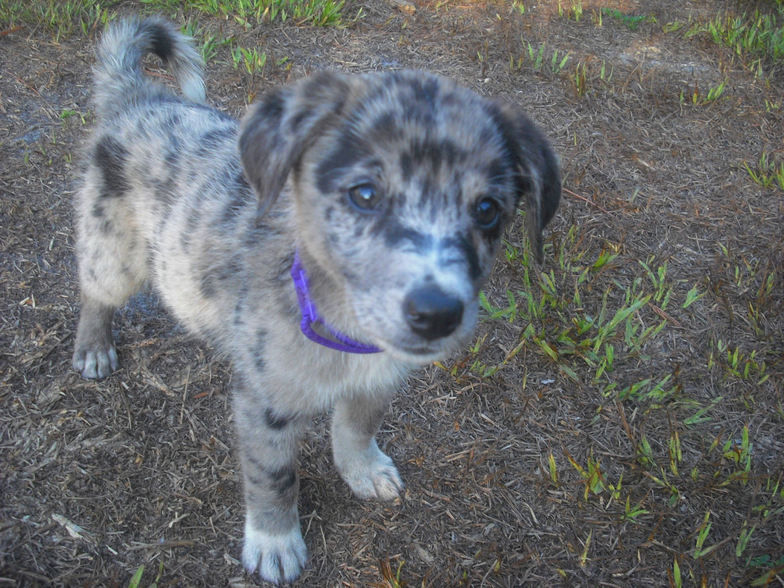 Having seen her and her littermates, I suspect that Partly Cloudy is an Australian Shepherd, perhaps with some Catahoula in her. She is really quite lovely. Not only are her markings quite unique, her personality is endearing. She has a gentle way about her, playful but not overwhelming. Now, this might be due to her very young age, or it could be her underlying spirit. You can enjoy many pictures of her in her photo album.
