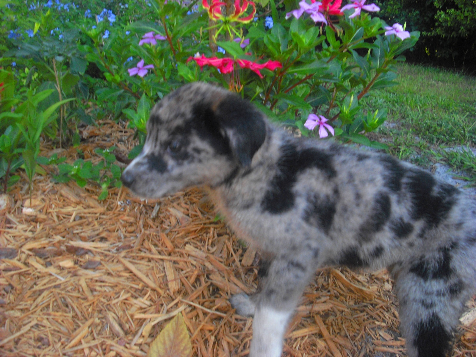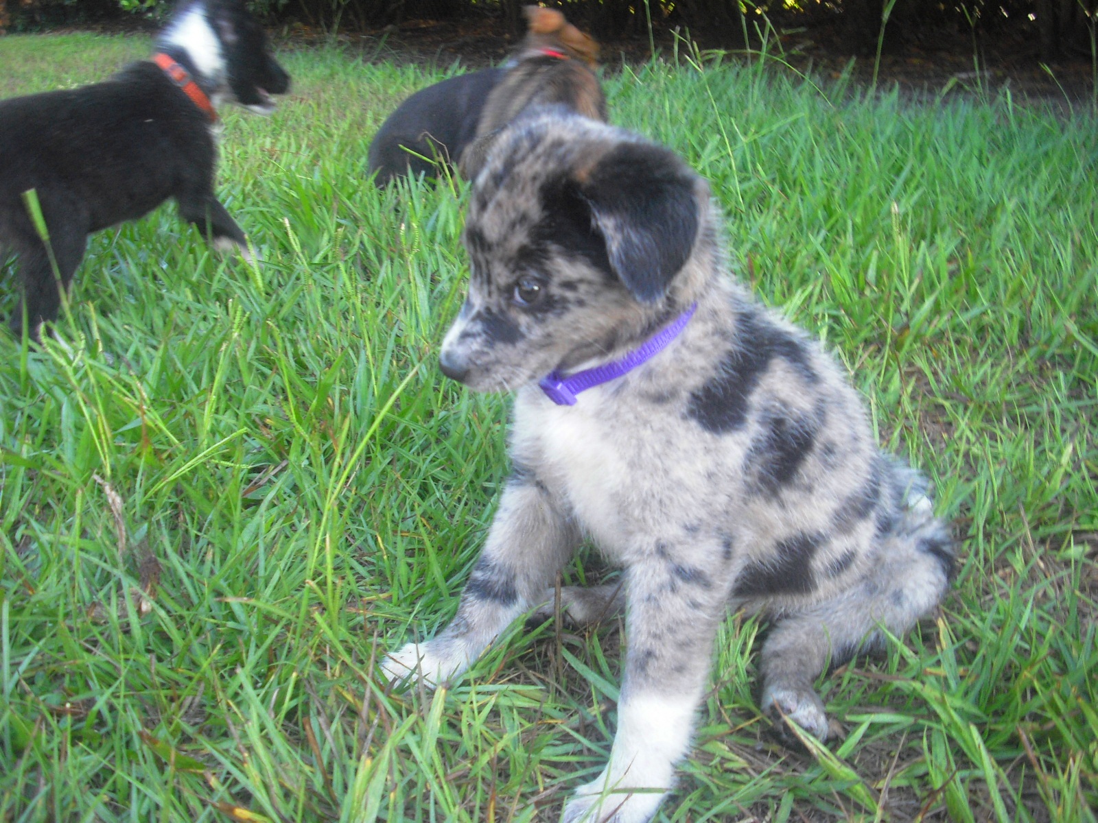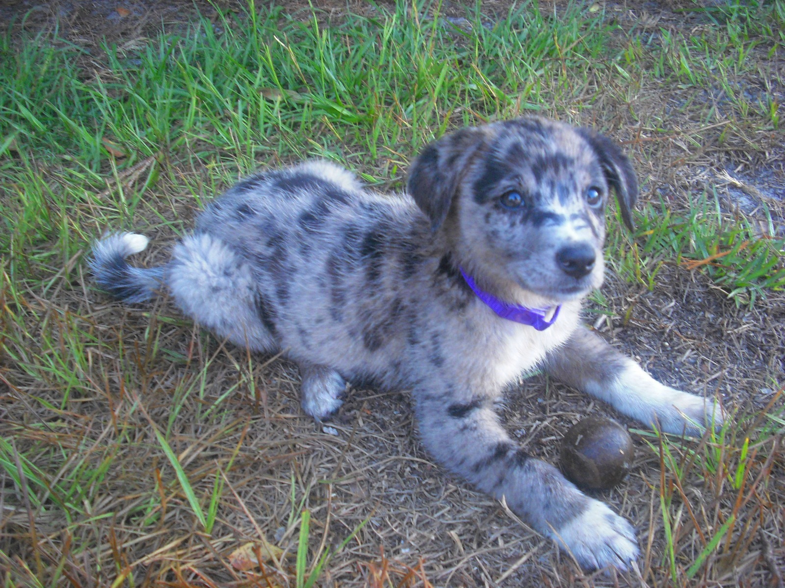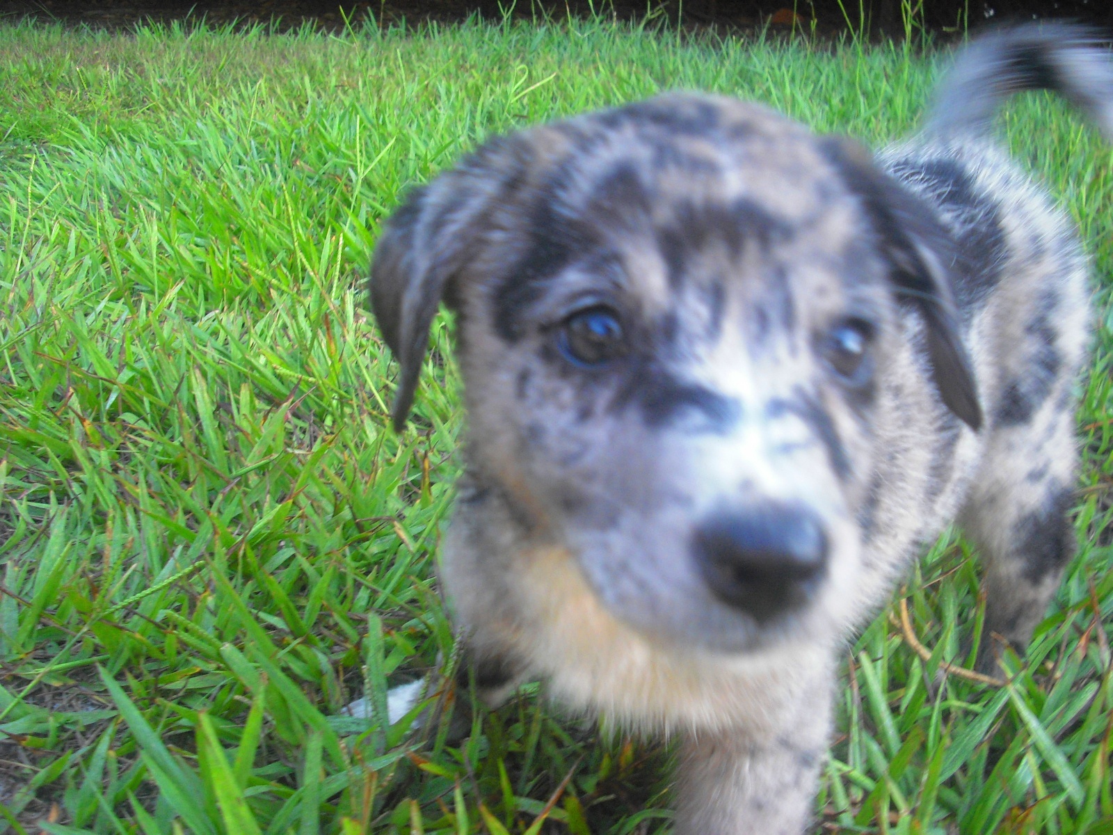 Having seen her and her littermates, I suspect that Partly Cloudy is an Australian Shepherd, perhaps with some Catahoula in her. She is really quite lovely. Not only are her markings quite unique, her personality is endearing. She has a gentle way about her, playful but not overwhelming. Now, this might be due to her very young age, or it could be her underlying spirit. You can enjoy many pictures of her in her photo album.