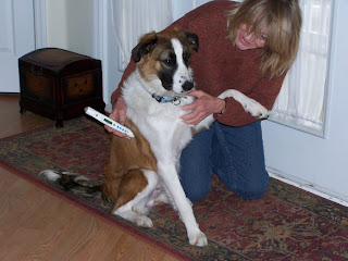 Just thought I’d drop you a note and let you know that Saint has been such a good boy. He’s getting the hang of travelling with me, is a willing demo dog, and loooovvvveees being a couch potato in the evening after a hard day’s work. He’s definately got the idea of not bothering the cats, but is still interested in the horses more than I’d like. That’s kind of a work in progress. He’s been absolutely stellar about housebreaking and has been great about waiting in the truck when I can’t have him accompany me. He’s starting to relax and not worry about getting in the truck in the am. At first I think he was afraid he was going back or to the vet or something. Now he just hops in and waits to see where we’re going next.