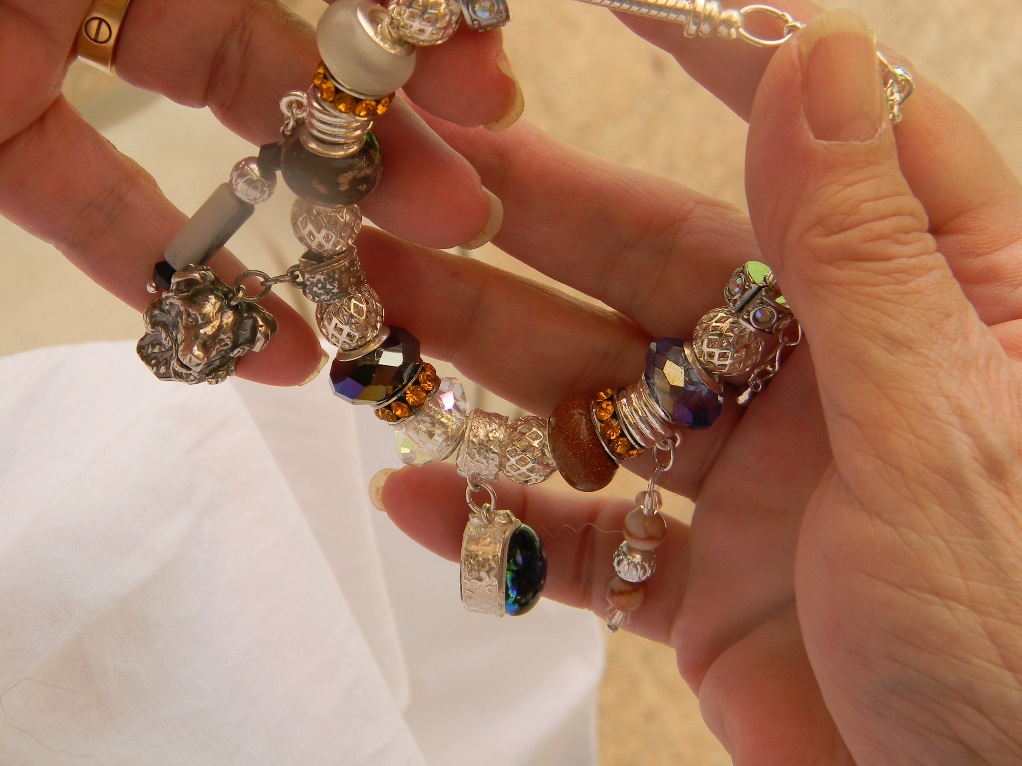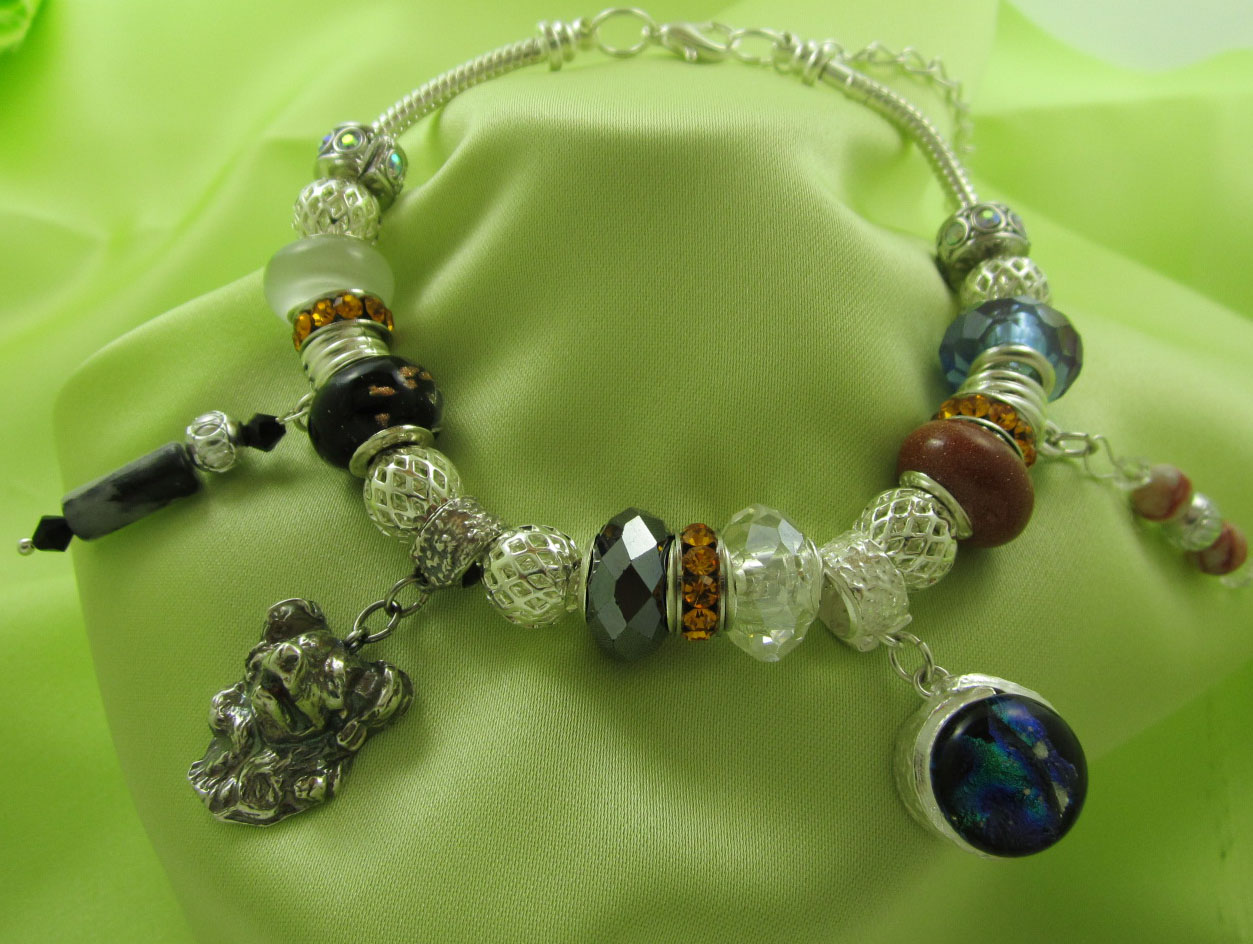 The bracelet is a mixed metals piece of silver plate, copper, alloys, natural stones, crystals and lampworked and Murano glass charms. These were collected and purchased from around globe, specifically Czech Republic, Australia and the Orient. Some of the stones, beads and dangles included on our bracelets are: